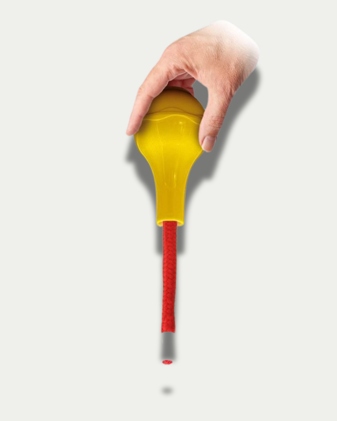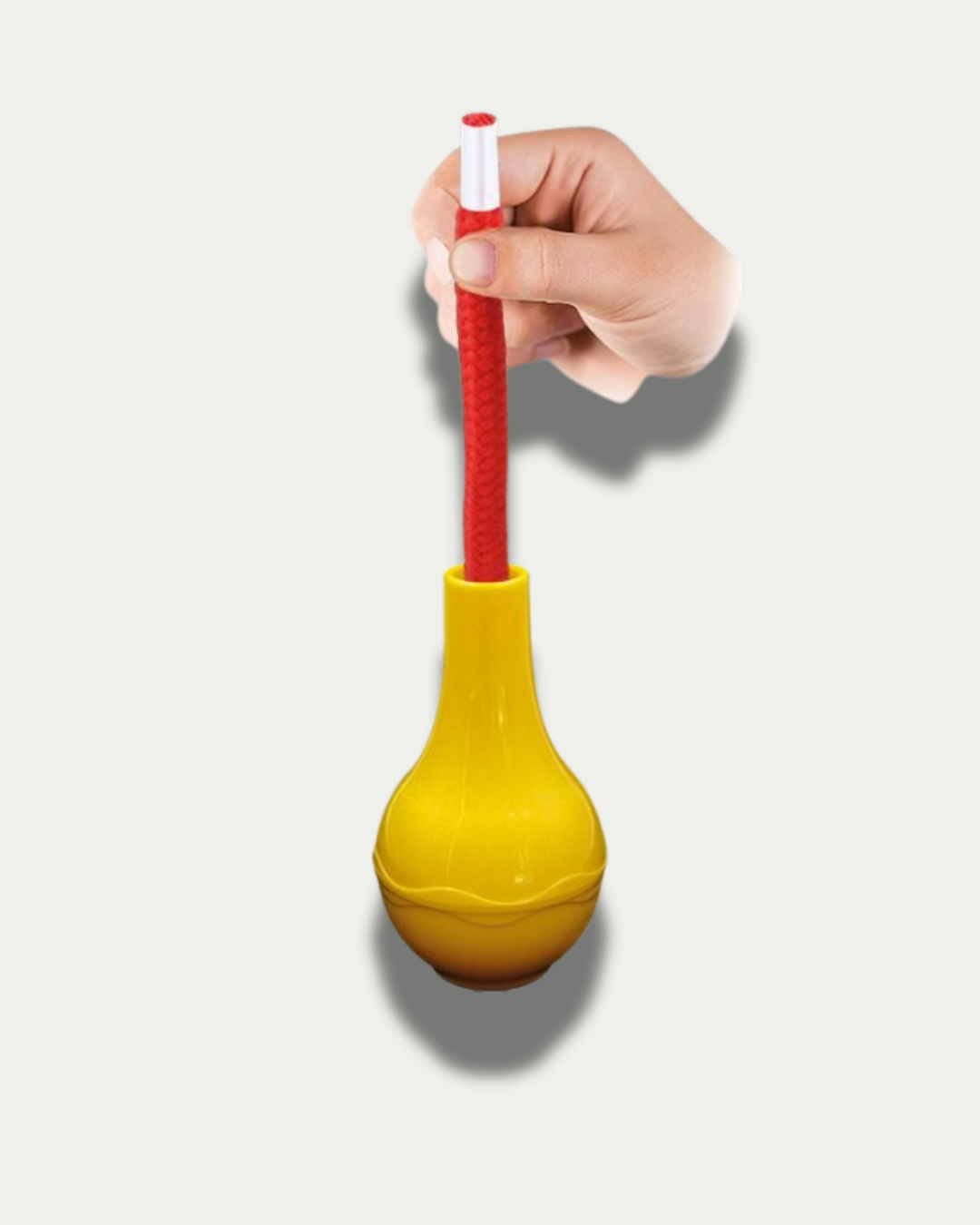 El mago muestra una pequeña cuerda roja y una botellita amarilla. Introduce un extremo de la cuerda dentro de la botella y gira ambos objetos boca abajo al mismo tiempo.